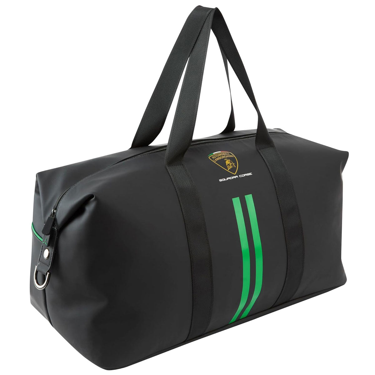 Lamborghini Holdall Bag An incredibly smart Lamborghini holdall bag ideal for the gym, days out or a short break away. Large main compartment joined by gun metal hardware to the adjustable branded padded shoulder strap and two padded grab handles. Double viper green stripes, reinforced stitched panels for added handle strength, green detailing throughout and 3D epsilon zip pull. Bag dimensions maximum size - 12.5 x 20.5 x 12.4 inches H x W x D. Material: Nylon