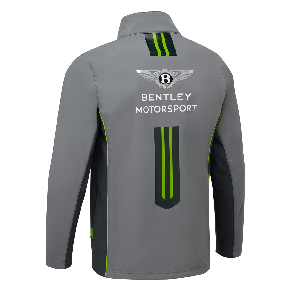 Bentley Motorsport Softshell Jacket Our lightweight softshell jacket is the perfect piece for a cool day at the racetrack. The grey jacket features a white panel on the chest, detailing both the Bentley Motorsport and Mobil 1 logos. A large Bentley Motorsport logo adorns the back of the jacket alongside a GT3 livery inspired stripe. The jacket is constructed in a breathable, wind repellent fabric ensuring supreme comfort, whilst two large zipped hand pockets complete with carbon fibre detailing make this a practical everyday piece. Finished with a Union flag on the right arm, the versatile jacket also features contrast side panels and sleeves and a Bentley side tag. 100% polyester.