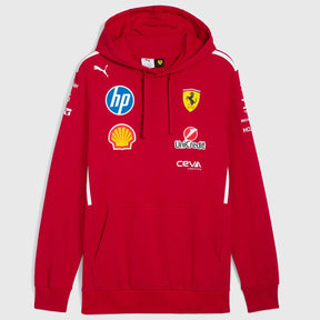 The official 2025 Scuderia Ferrari Team Hoodie from PUMA, recognisable as being based on the look worn by the team throughout the 2025 Formula 1 season. The Team Hoodie comes in Ferrari's 2025 Scuderia Red, with all the official Ferrari and PUMA branding.
