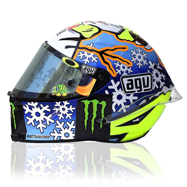 The 1:5 Mini Casco Replica – VR46 MotoGP Winter Test 2016 is a faithful miniature of the special helmet worn by Valentino Rossi during the MotoGP pre-season testing sessions. Designed by Aldo Drudi, this “winter edition” helmet captures a frosty theme with snowflakes, blue hues, and Rossi’s bright yellow #46 — symbolizing his warmth and determination even in cold testing conditions. The detailed artwork and authentic AGV graphics make it a standout piece for collectors. Presented in a protective display box, this mini helmet embodies Rossi’s creativity, energy, and unmistakable racing spirit.