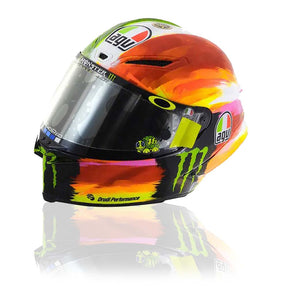 This 1:5 Mini Casco Replica features Valentino Rossi’s helmet from the 2019 MotoGP GP at Mugello. Designed with meticulous attention to detail, it faithfully reproduces the helmet’s vibrant graphics and colors. A must-have for MotoGP fans and VR46 collectors, this mini replica is durable, visually striking, and perfect for display in any racing memorabilia collection.