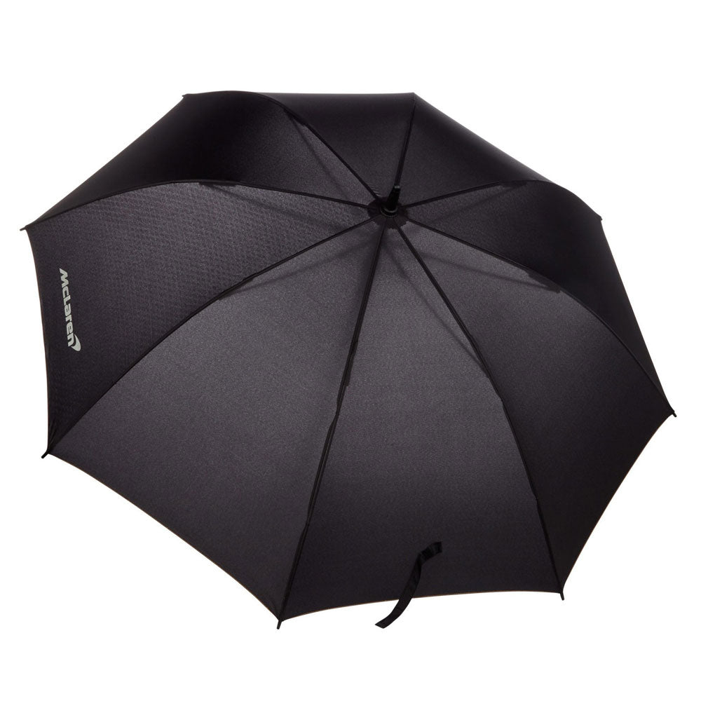 Keep yourself race ready with this McLaren Automotive Golf Umbrella. In a sleek black and minimal branding this umbrella is for those who like the sport but don't want to shout about it. The McLaren Logo is in a Pearl White contrasting nicely with the rest of the Umbrella.